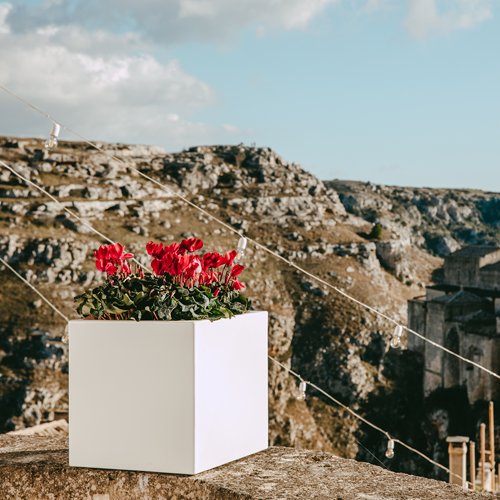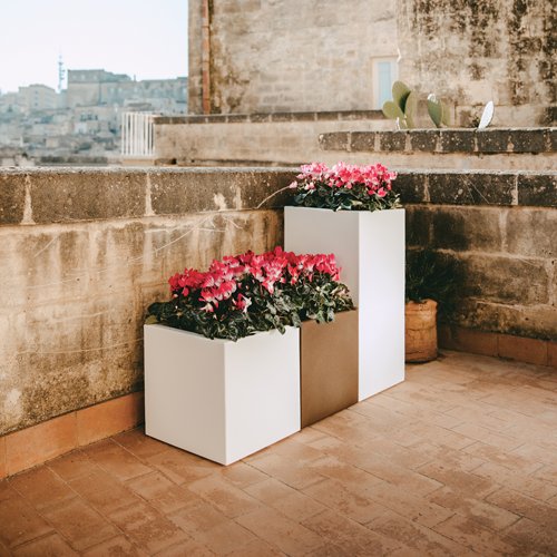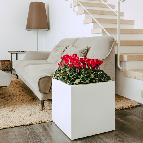 Der CUBE Pflanzkübel in der Farbe weiß ist durch seine schlichte, quadratische Optik vielseitig einsetzbar und optimal für den Innen- und Außenbereich geeignet. Die kubische Form, kombiniert mit der hellen Farbe und einer modernen matten Oberfläche, gestaltet Wohnraum und Garten lebendig und komfortabel.