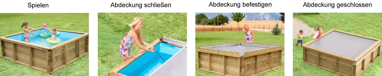 Unser Pistoche Massivholz-Kidspool ist mit einer Sicherheitsabdeckung versehen. Nach dem Baden lässt sie sich einfach und diskret schließen und verhindert
