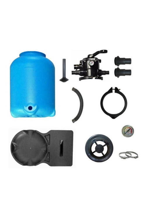 Inklusive Manometer, Schauglas, Filterpalette und Einfüll-Hilfe für das Filtermaterial (Sand oder Glas).