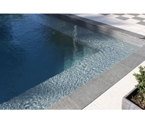 Die Serie besticht durch ihre schlichte Eleganz und gehört zu den beliebtesten und schönsten Poolumrandungen im Naturstein Bereich.