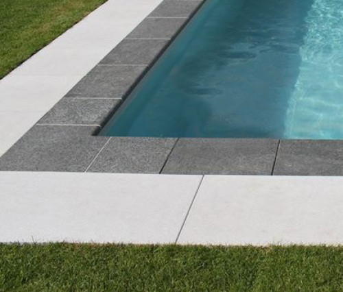 Die Beckenrandsteine werden aus Natursteinblöcken im Format 30 x 60 cm ausgeschnitten. Die Serie ist vorne gerundet und bietet 4 Granitsteine, 1 Basalt und 3 Travertin-Steine an. Ein skandinavisches Design mit dem Wunsch, einen Beckenrandstein anzubieten, die dem Poolbereich ein exklusives und minimalistisches Aussehen verleiht.