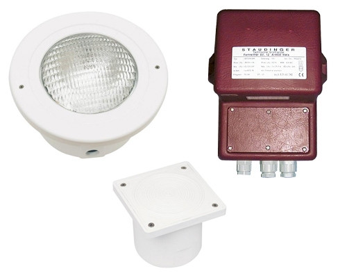 Das Set besteht aus 1 Stk. Peraqua Scheinwerfer 300 Watt/12V aus ABS-Kunststoff. Die Kabelklemmdose