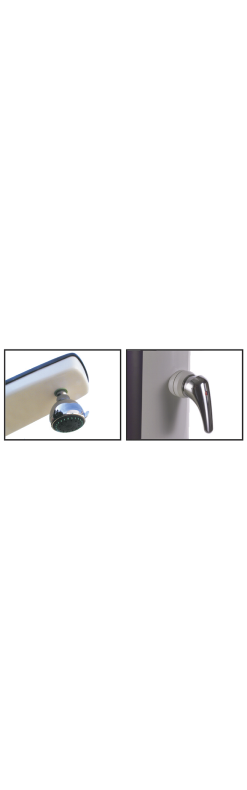 Elegante Solardusche mit solarbeschichtetem Aluminiumtank (innen und außen beschichtet) in weiß inkl. Abdeckhaube